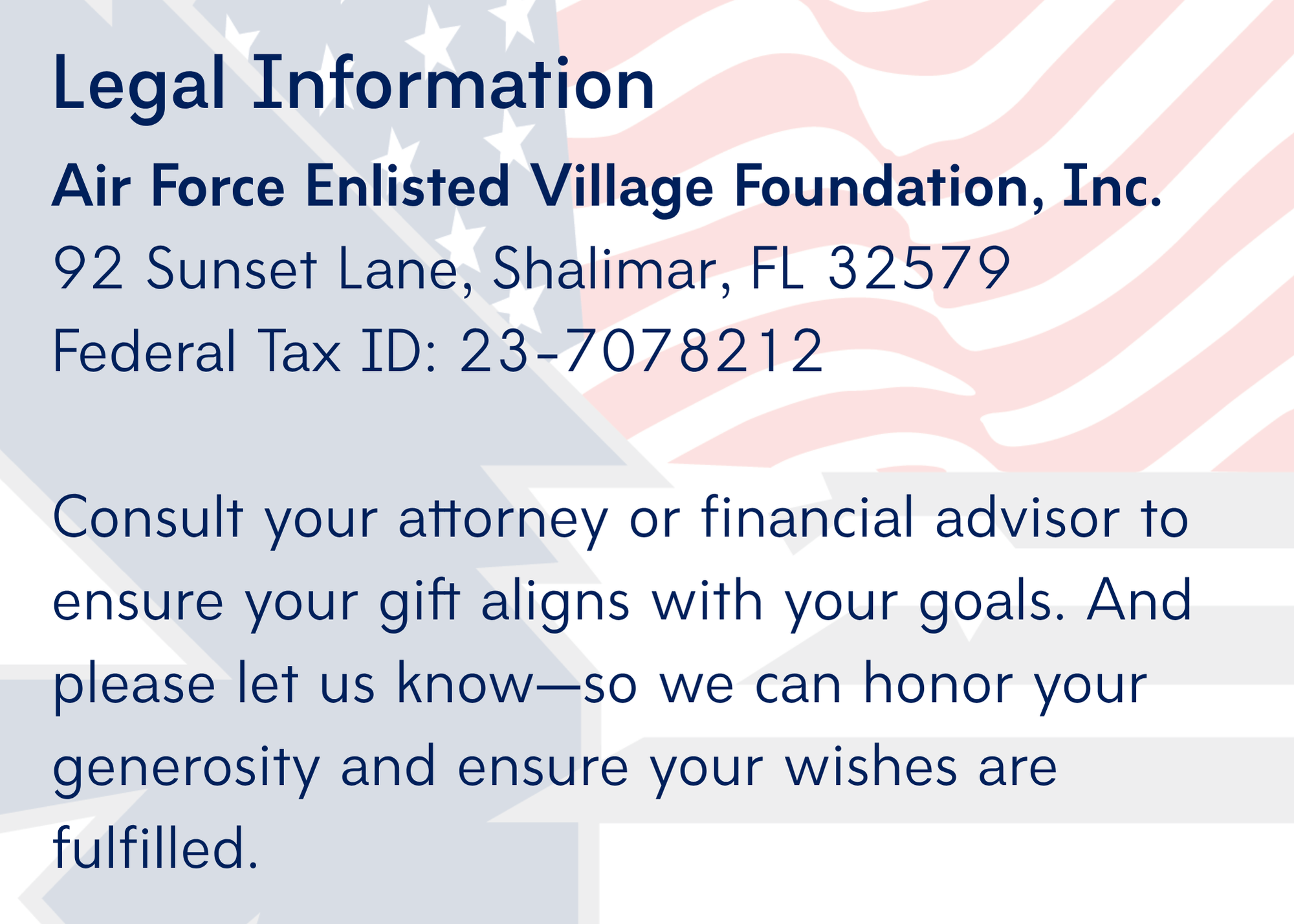 “I hereby give, devise and bequeath to Air Force EnlistedVillage Foundation, Inc., 92 Sunset Lane, Shalimar, FL 32579 (Federal Tax ID:23-7078212), ____________% of the residue of my estate or the sum of$_______________ (or the following property described herein).”